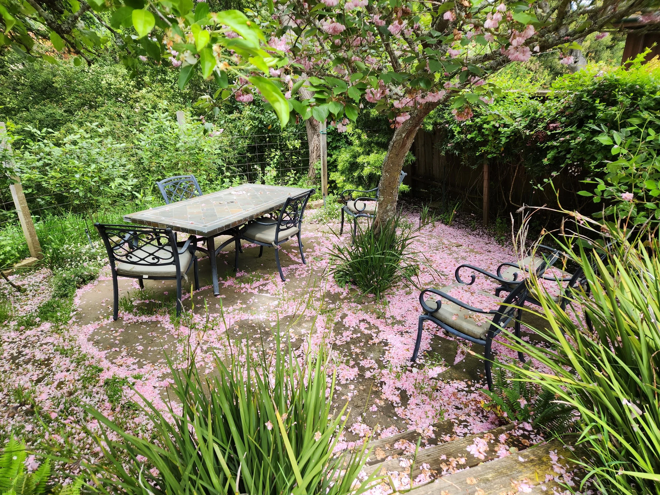 This time of year my garden is abuzz. Three out of four cherry trees are blooming which attracts thousands, maybe millions of bees. If you stand anywhere in my backyard, you hear the industrious sound of them overhead. They are so loud! Pink flower petals carpet the ground and the patio and we inevitably bring those petals into the house on our feet and fur. In short, it’s a beautiful mess. In a few days, the petals will become a slimy hazard, and I will need to clear them off the flagstones. But not yet. Today I’m going to sit quietly, listen to the hum overhead, watch the petals flutter down like snowflakes and savor my tiny part of this messed up world.